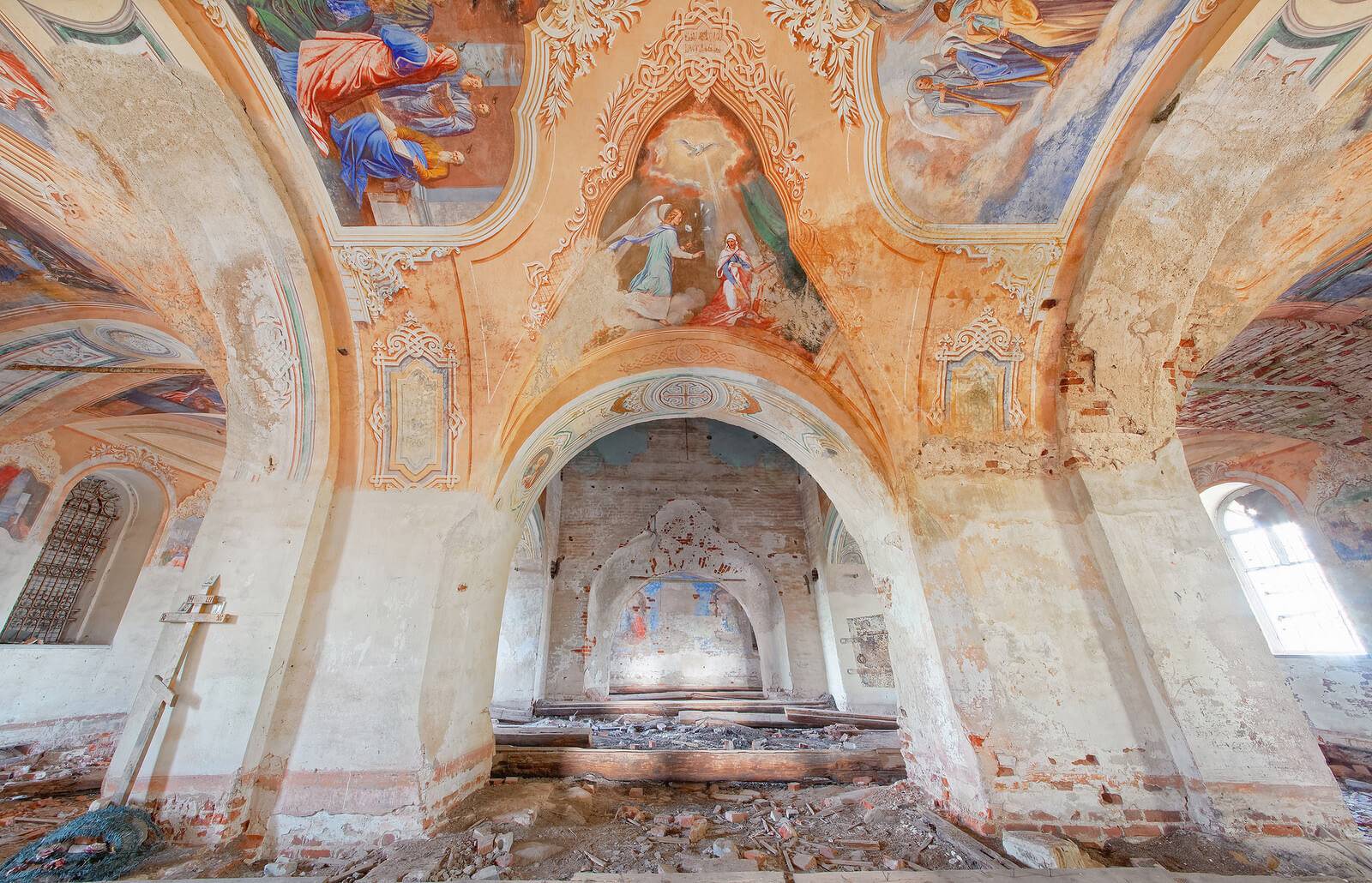 Не смотря на закрытые двери проникнуть внутрь не сложно, но этого лучше не делать из-за сильно обрушенной крыши, которая может в любой момент полностью рухнуть.