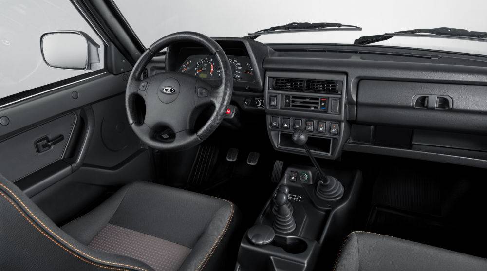 Существенной разницы в плане внутреннего убранства между Нивой и Нивой Урбан нет. Как и прежде, дизайн устаревший, приборная панель от второй Самары. Зато руль сделали меньше по диаметру, а обод прибавил в толщине. Центральная консоль выполнена в стиле минимализм. На тоннеле около коробки передач поставили рычаг раздатки, понижающей передачи, а также панель, с помощью которой осуществляется управление стеклоподъёмниками, регулируются зеркала.