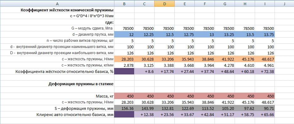 Если мы хотим сохранить клиренс, но ужесточить подвеску, нам необходимо изменить параметр х в сторону уменьшения за счет увеличения коэфициента жесткости, при этом на столько же, насколько изменили значение х, необходимо выбрать пружину короче. Если мы увеличим только жесткость, но при этом длина пружина останется прежней, авто станет жестче, но при этом приподнимется.