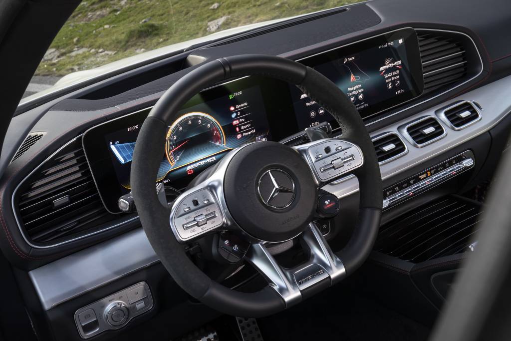 В салоне GLE Coupe располагаются сдвоенные цифровые экраны, один из которых заменяет собой панель приборов. Под мультимедийным дисплеем размещены сразу 4 дефлекторы обдува и блок управления климатом, выполненный в виде тонкой полоски. Трансмиссионный тоннель по бокам украшен декоративными выступами, напоминающими ручки и дополняемыми светодиодной подсветкой. Между ними производитель поместил широкий джойстик управления мультимедиа и кнопки, предназначенные для настройки шасси. Благодаря длинной колесной базе задний ряд сидений обеспечивает комфортабельную посадку. А багажный отсек по той же причине вмещает в себя до 655 литров груза.