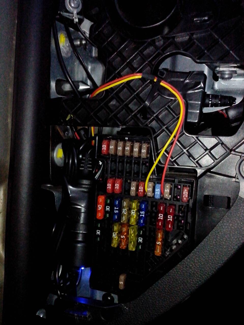 Далее все просто — вооружившись вольтметром, находим в салонном блоке два предохранителя, или два места для предохранителей, на которых +12В есть всегда и появляется только при включении зажигания. В моем случае в блоке нашлись “пустые” места: №15 с постоянным +12В и №17 с появляющимся напряжением при повороте ключа. Сверился с инструкцией к автомобилю и с наклейкой на крышке блока предохранителей, №15 — не используется, №17 — для сцепного устройства. При этом, у этих двух гнезд был разведен только 1 контакт, что даже к лучшему. Купил парочку 5А мини предохранителей (по 10р), желтый провод (B+) пошел на №15, красный (ACC) на №17. Таким образом, помимо предохранителя в самом устройстве, оба плюса дополнительно защитились “личным” предохранителем. Поначалу подключил плюсы наоборот, питание на устройство подавалось не правильно, светодиод в коробочке сигнализировал об этом частым морганием (самодиагностика, хорошо сделали). При правильном подключении светодиод будет гореть постоянно при включенном зажигании и моргать раз в пол секунды при питании от аккумулятора. Массу подложил под ближайший болт. Вот что получилось в итоге: