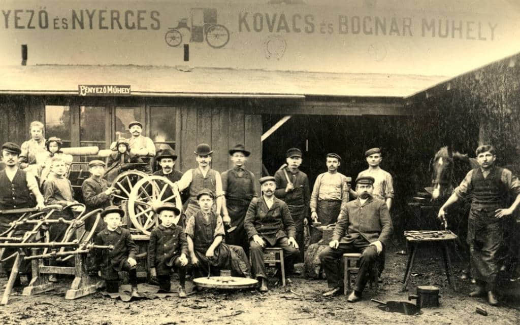 Работники каретной мастерской и ее основатель Юри Имре (усатый господин справа) 1908 год