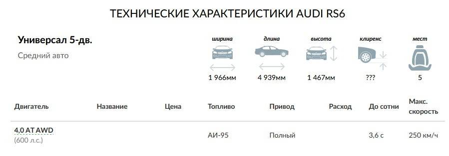 Скоростные показатели отражают спортивный дух Ауди — разгон до сотни у обеих моделей составляет 3,6 секунд. Если верить спидометру, RS 6 и RS 7 способны разгоняться до 250 км/ч.