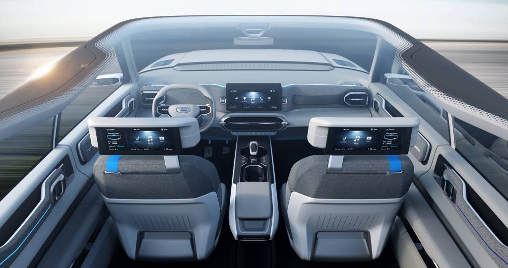 Панель приборов получилась крайне интересной и уникальной. Она тоже отделана тканью серого цвета, которая делает невидимыми выключенные приборы. При включении питания сквозь нее просвечивается вся необходимая информация. Центральная консоль будто парит в воздухе, на ней располагается беспроводное зарядное устройство, предназначенное для смартфонов.