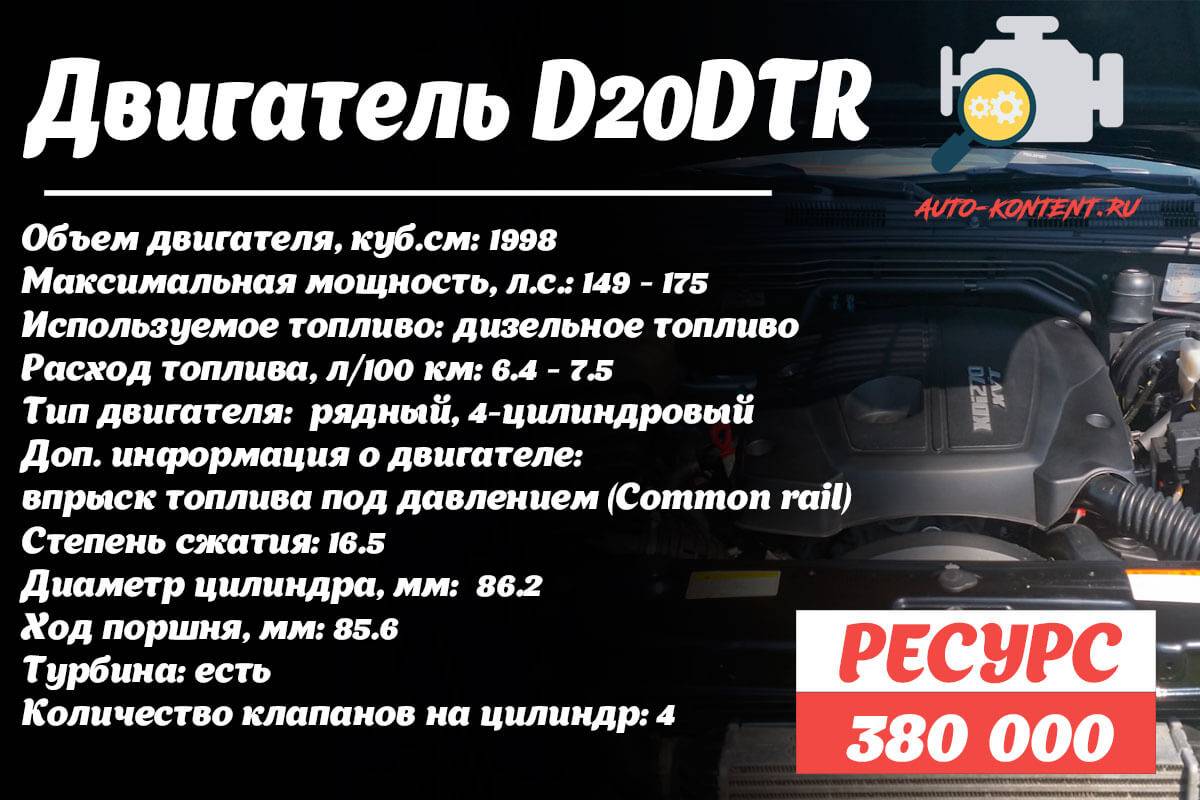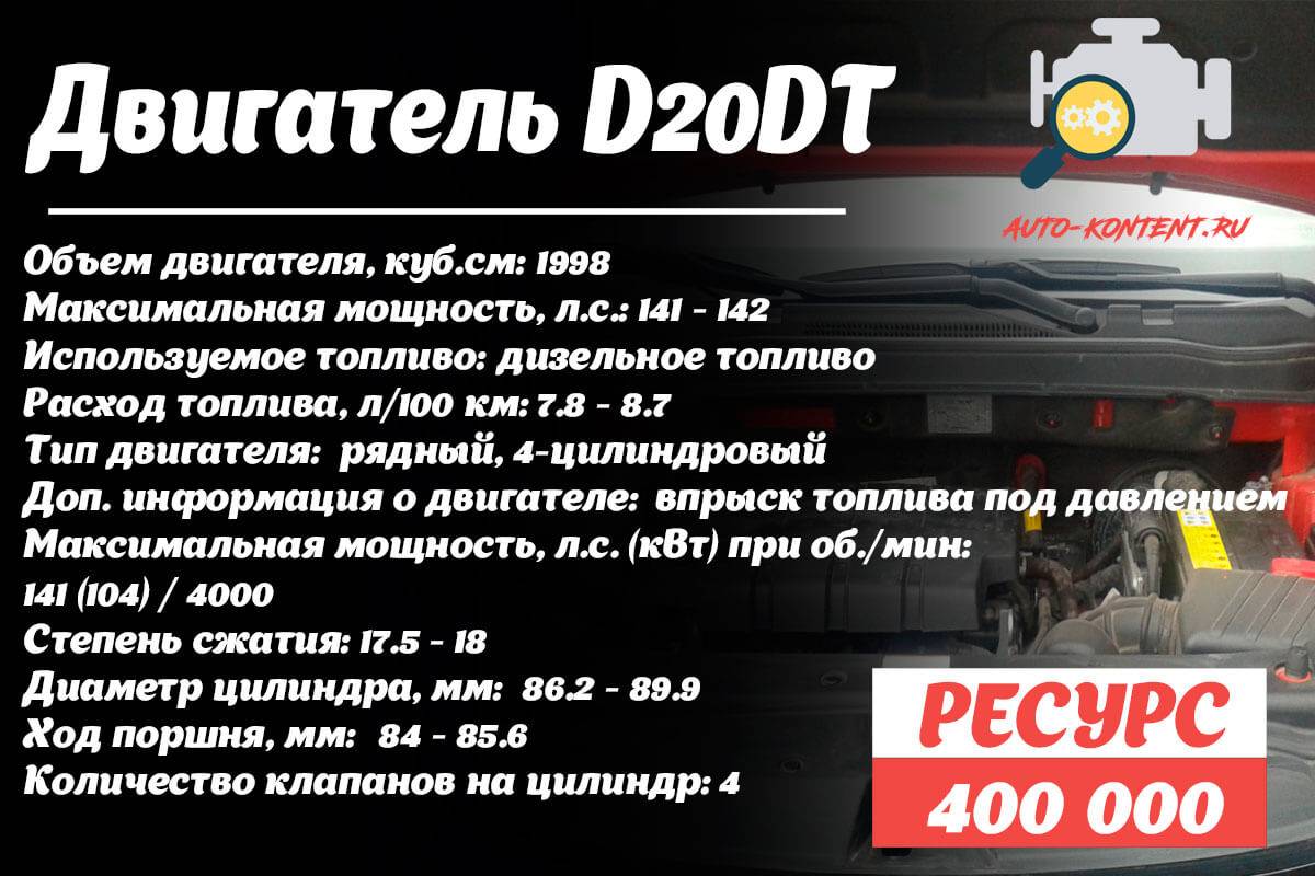 Производство дизельного мотора с рабочим объемом 1998 куб. см началось в 2005 году. Конфигурация силовой установки обычная – рядная четырехцилиндровая чугунная установка. Это первый корейский дизельный двигатель, получивший топливную систему Common Rail. Автомобили с D20DT под капотом получили широкое распространение не только в России, но в и Европе. Двигатель сконструирован еще по старым принципам моторостроения – чугунный блок цилиндров с накрытой сверху головкой блока цилиндров из алюминия. В блок помещен коленчатый вал с ходом 84 мм, это короткоходная силовая установка, так как диаметр цилиндров составляет всего 86 мм. За счет продуманной архитектуры инженерам удалось добиться максимальной отдачи мощности D20DT в верхнем диапазоне оборотов. Головка блока 16-клапанная, конструкцией предусмотрено по 4 клапана на каждый «котел». В техническом плане газораспределительный механизм обычный – DOHC с двумя распредвалами.