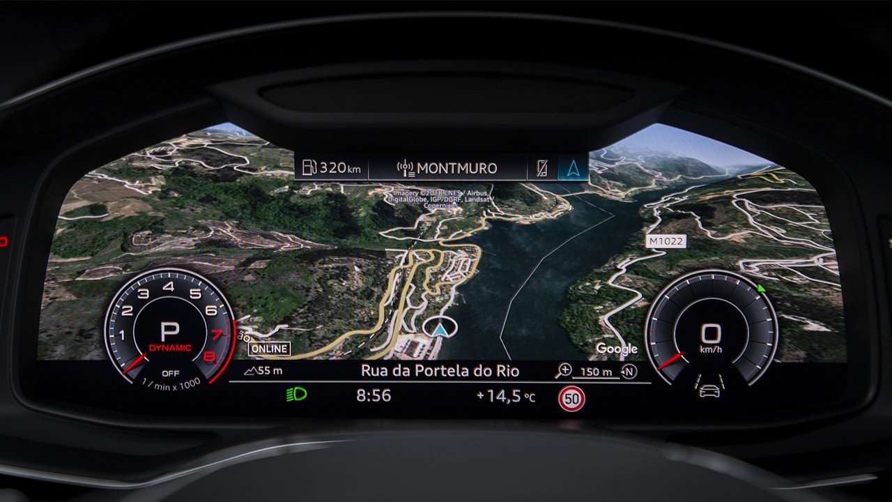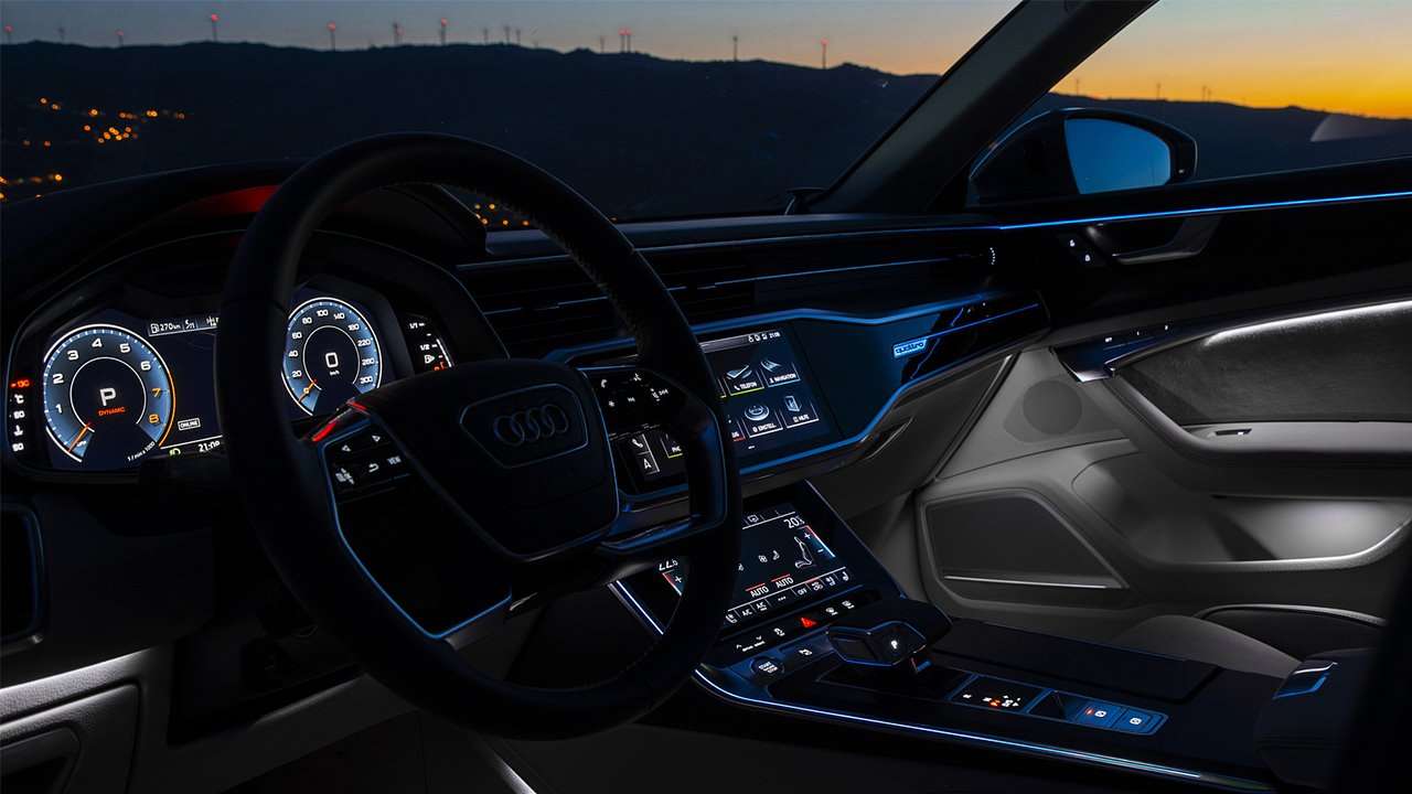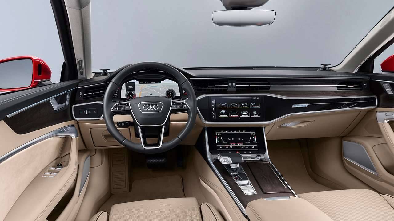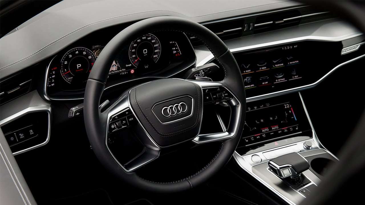 Место водителя обзавелось новым 4-спицевым рулем с двумя хромированными спицами внизу и окантовкой вверху. Колонка с подогревом и лепестками переключения передач. В спортивной версии руль будет 3-спицевым, да, это удобнее, но новый 4-спицевый красивее. Водитель Audi A6 видит перед собой 12,3-дюймовый дисплей virtual cockpit вместо классического щитка приборов, который имитирует любые аналоговые приборы и показывает данные системы навигации. Впервые такое решение Ауди применила на Audi TT.