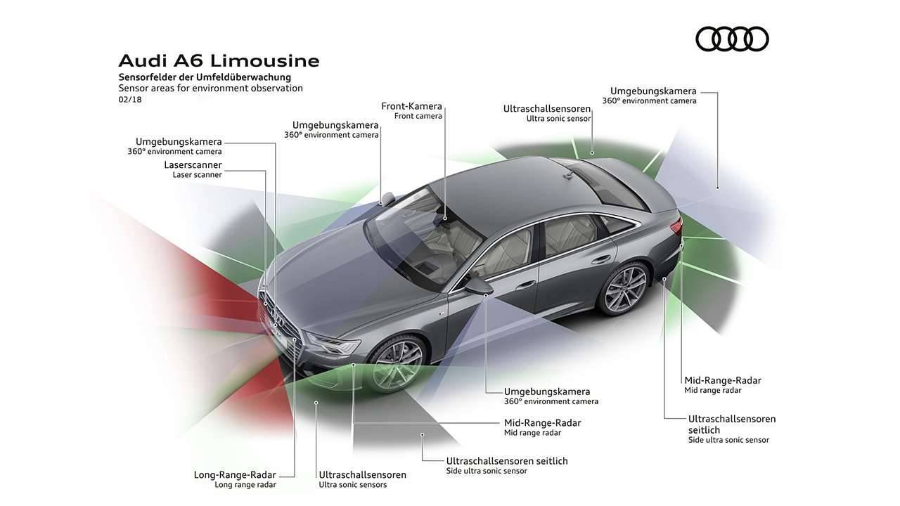 В автомобиле установлен комплекс датчиков ультразвука, радаров и камер, общее количество которых больше 20. Их задача анализировать ситуацию и сообщать ее разным системам. Помимо уже привычного кругового обзора Audi A6 new может сама парковаться в любых местах. Также она не позволит открыть дверь, если с той стороны видит приближающийся транспорт.