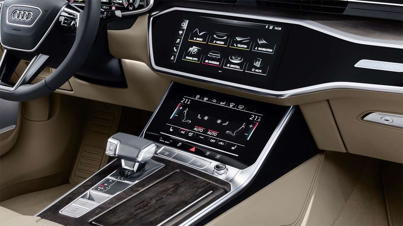 Мультимедиа MMI touch response разделена на два экрана. Наверху устанавливается 8,8-дюймовый дисплей с хромированной окантовкой, либо 10,1-дюймовый опционально. На переходе к тоннелю вставлен 8,6-дюймовый дисплей. Верхний ответственен за мультимедию, а нижний за настройку раздельного климат-контроля.
