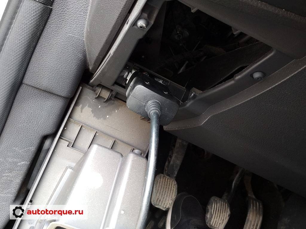 Расположение диагностического разъема для многих становится загадкой. Тут всё просто – нужно просто открыть вещевой ящик слева от руля, сплющить его рукой и оттянуть ещё ниже.