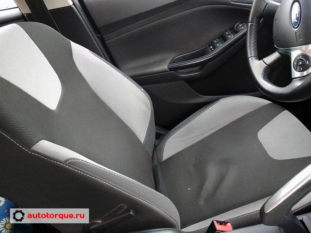 Мягкий и современный салон Ford Focus 3 является его сильной стороной. Первоначальный внешний вид, в отличие от одноклассников сохраняется долгое время. Единственное, набивка сидений не очень хорошо держит форму – продавливается, что хорошо видно по подержанным автомобилям. Дело даже не в дешевизне материалов отделки, а в форме боковин, которые принимают на себя всю массу тела при посадке/высадке.