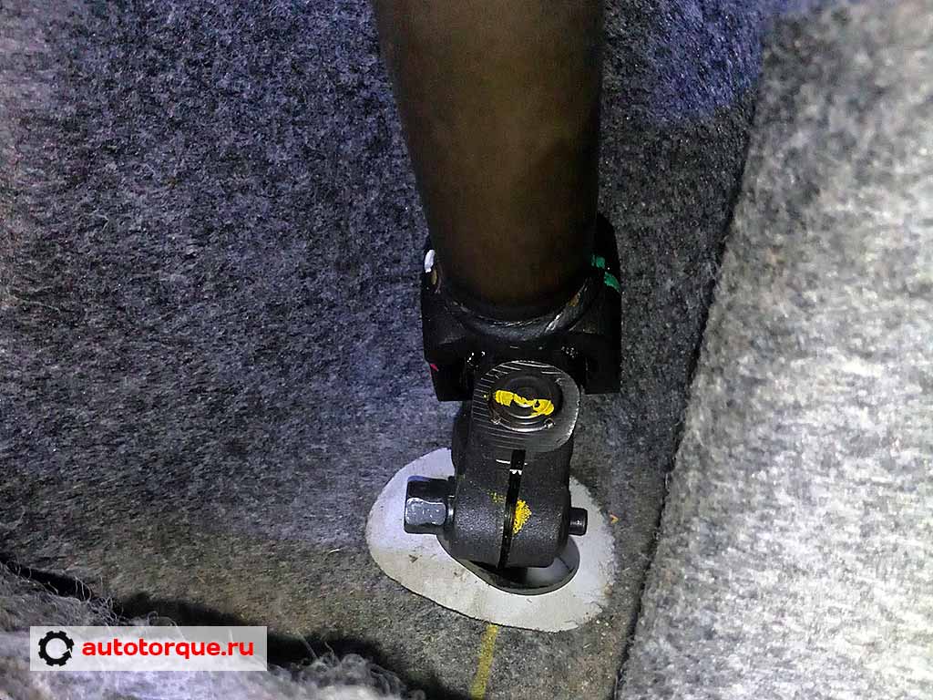 Рулевая система стуками не напрягает, а первые люфты при покачивании баранки из стороны в сторону решаются подтяжкой шлицевого соединения колонки возле педального узла