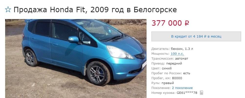 Хонда Фит, популярна в России, цены на первое поколение начинаются от 200 000 до 350 000 рублей, цена на аналогичную модель Honda Jazz, стоит также.