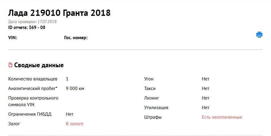 Однако даже если машина не принимала участие в авариях и, как правило, цела, не спешите с выводами. Лучше проверить её внимательно. Гранта ниже, к примеру, смотрится вполне себе ничего. А вот отчет показывает подвох. Машина в залоге. Другими словами, вы под немалым риском приобрести машину два раза, если хозяин перестанет погашать долг банку. Стоит еще сказать, что и штрафы есть не оплаченные.