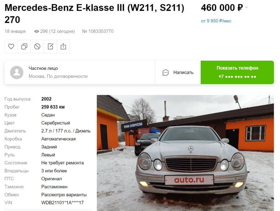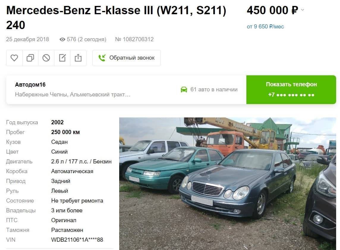 Средняя цена седана W211 — около 490 тыс. рублей. За эти деньги мы нашли полноприводную модель 2004 года выпуска с мотором 3,2 л, 234 л. с. и АКПП: