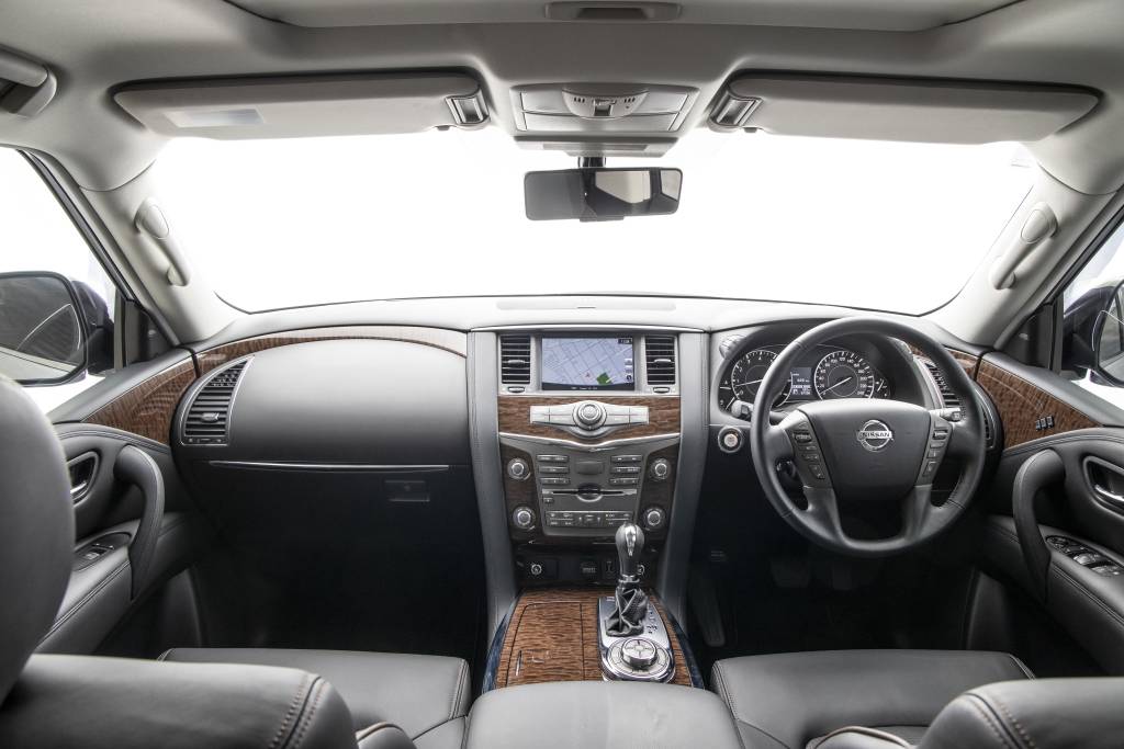 Салон у Patrol имеет премиальное, но в определенном смысле устаревшее исполнение. Дизайн центральной консоли, которая в верхней части, где закреплен сенсорный монитор, немного изгибается назад, не менялся уже на протяжении практически десяти лет. На ней, как и прежде, присутствуют многочисленные физические клавиши. Сама центральная консоль, как и ряд других деталей интерьера, обшита в топовых версиях натуральным деревом с лакированным покрытием. Приборная панель у Patrol все еще аналоговая. При этом японский внедорожник обеспечивает высокий уровень комфорта за счет продуманной конфигурации всех сидений и качественной кожи. Этому способствуют и крупные габариты автомобиля, благодаря которым в багажный отсек вмещается до 668 литров груза при установленном третьем ряде сидений.
