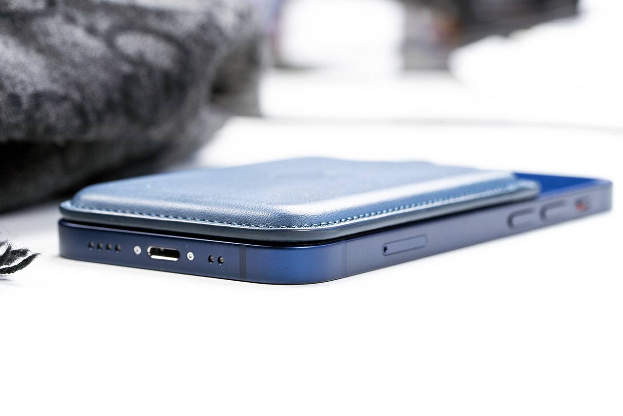 Leather Wallet Case также прекрасно примагничивается к айфону мини через надетый чехол. Такой «бутерброд» делает компактный флагман толще, что для некоторых пользователей может быть удобно.