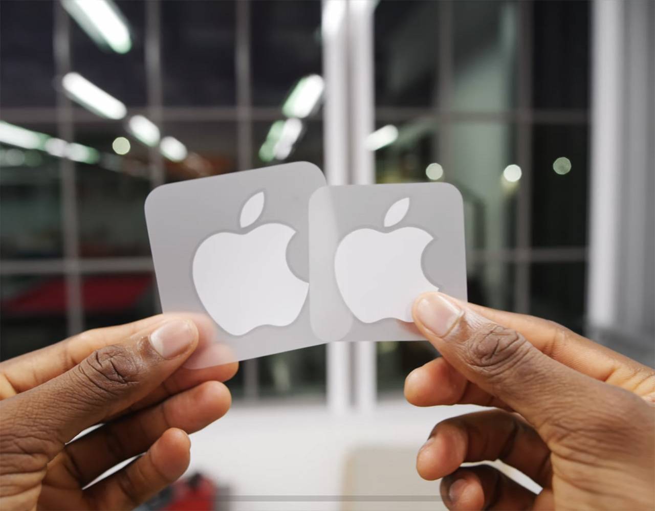 Слева – наклейка с яблоком в комплекте с iPhone 12, 12 Pro и 12 Pro Max. Справа – наклейка из коробки с iPhone 12 mini. Отличается размером в меньшую сторону 🙂