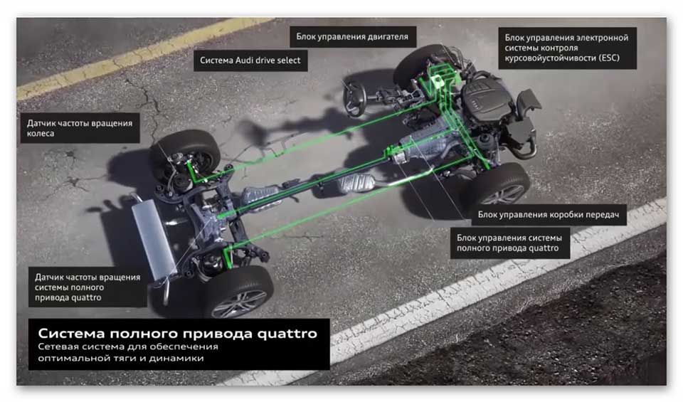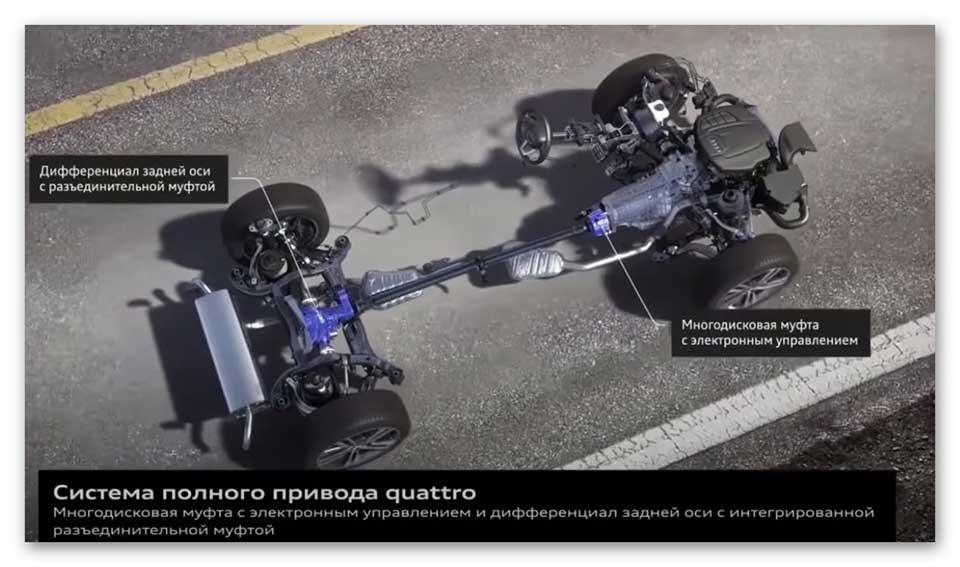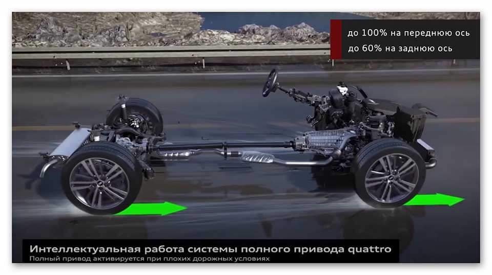Система управления «Quattro» – это постоянно подключенный полный колесный привод, по умолчанию здесь 60% крутящего момента (КМ) передается на переднюю ось, 40% – на задние колеса.