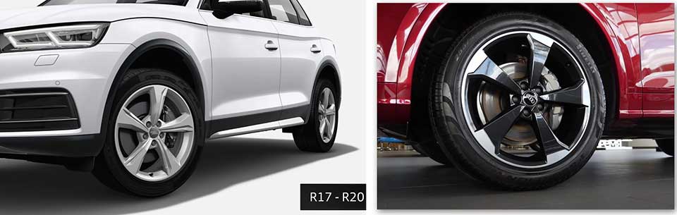 Audi Q5 в базе наделяется колесами R17 235/65 и коваными дисками (10-спицевый рисунок), авто в модификациях Sport и Design по умолчанию оснащается шинами R18 235/60.