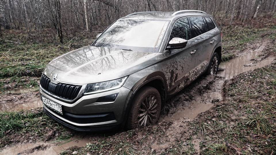 Вместе с тем Kodiaq на грунте уверенно держит курс даже с забитым протектором, то есть короткоходность подвески не мешает ему держаться за дорогу и слушаться руля. Да и до прямо вот пробоев довести ее трудно — мы по крайней мере не смогли.