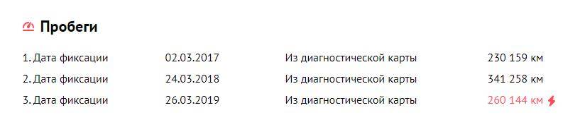 В марте 2018 года в диагностической карте зафиксировали более 341 тыс. км пробега, через год он «снизился» до 260 тыс. км: