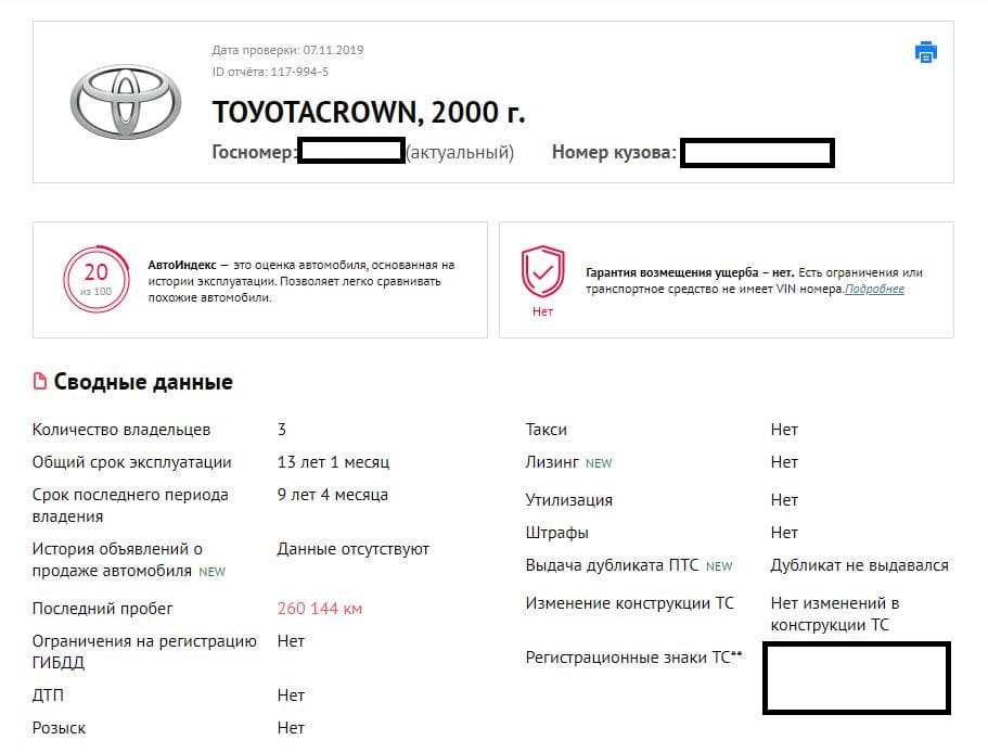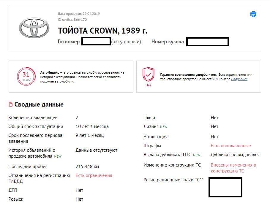 Также рекомендуем проверять «Крауны» на ограничения. Если они есть, вы не сможете переоформить машину на себя. У этого экземпляра, помимо ограничений ГИБДД, нашлись еще неоплаченные штрафы:
