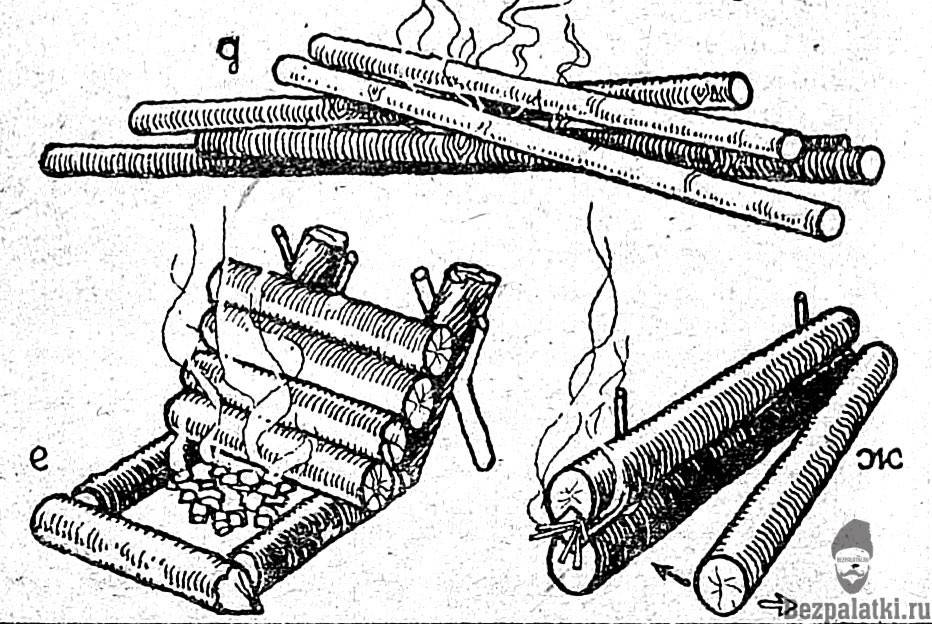 Нодья (рис. костры—ж)—костер очень длительного действия (к этому же типу относится финский костер ракотум). Для нодьи необходимо подыскать подходящее топливо, —иначе она будет очень плохо гореть. Лучшее топливо для нее — сухостойная ель или сосна, смолистая ель, кедр, в Уссурийском крае — ильм. Пихта, которую неопытный турист может смешать с елью, не годится для нодьи. Ель надо разрубить на поленья в 2,5 — 3 м длины, 2 . из них укладываются друг на друга и закрепляются колышками, а третье, служащее регулятором, прикладывается сбоку. Нодью разжигают, помещая растопку между бревнами регулятора нодьи или же вырубают по всей длине обоих бревен желоба, которые образуют при накладке бревен друг на друга подобие тоннеля. Сюда! по всей длине желоба кладут растопку из бересты, сухого мха, зажигательных палочек (см. ниже) и разводят огонь.