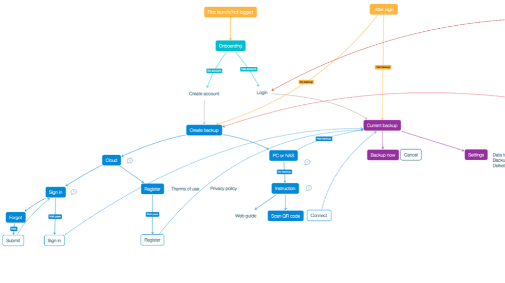 Далее необходимо нарисовать mind map на основе предыдущих ответов. У вас получится точная схема, по которой вы будете двигаться. Вы четко увидите, как ваш продукт работает и что можно улучшить, чтобы им было удобнее пользоваться. И только теперь можно браться за low fidelity прототипы.