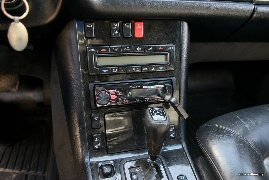 Под ними находятся климат-контроль и кондиционер, магнитола. ESP, что было дико для середины 90 годов, потому что это и есть изобретение Мерседес бенц В140. Ниже установлены кнопки подогрева и регулировки жесткости задних амортизаторов. АКПП 5-ти ступенчатая, на первые модели устанавливались 4-х ступенчатые. Сбоку от селектора передач -регулировка и складывание зеркал, стеклоподъёмники, и абсолютный прорыв в те года — кнопка парктроника. Кнопка управления задней шторкой-неслыханная роскошь по тем временам. 2 небольших бардачка и один секретный с подстаканником. Зеркала с подсветкой для передних и задних пассажиров