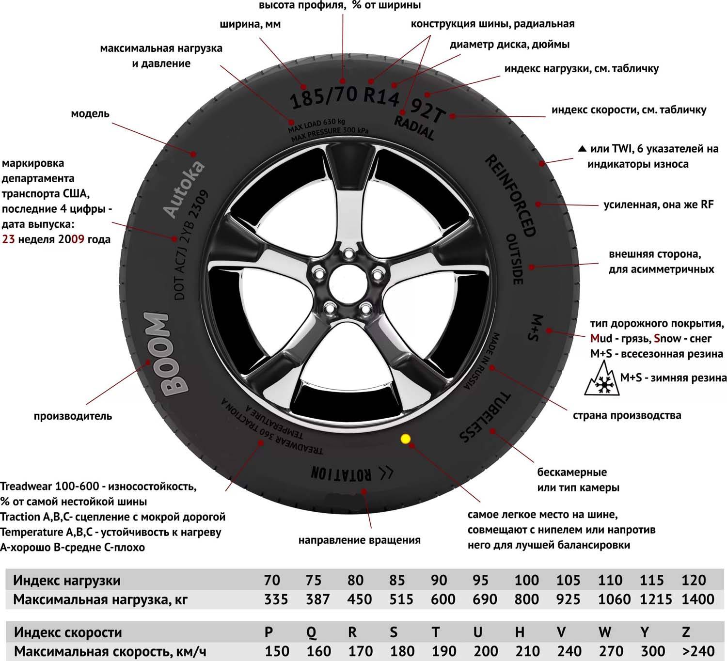 - R — обозначение типа шины — радиальная. Сразу после этой буквы стоит цифра, означающая диаметр шины