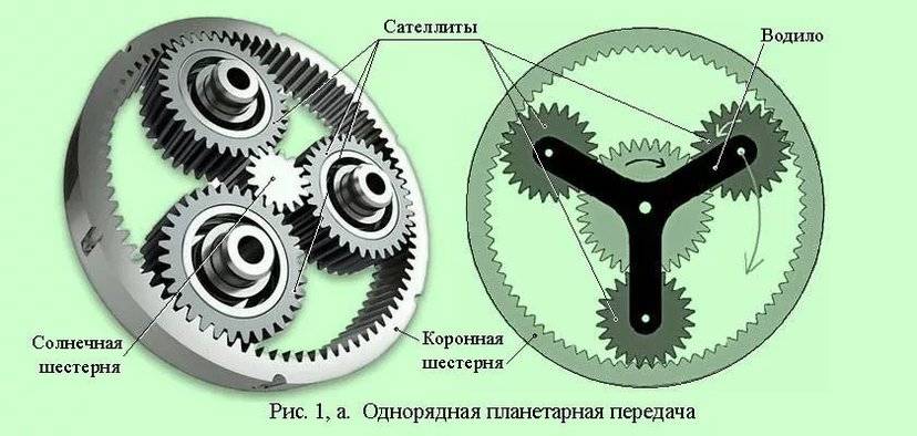 В гидромеханической АКПП чаще применяется планетарный механизм. При его простейшем устройстве крутящий момент подается к солнечной шестерне. С нею постоянно сцеплены свободно вращающиеся шестерни-сателлиты. На них предусмотрено водило, связанное с валом.