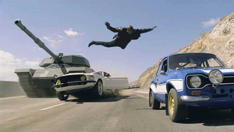 Новые грани абсурдного экшена — прыжок с парашютом на машине в горно-лесистой зоне, рыцарская дуэль на гигантских разводных ключах, таран небоскребов (!), дрона (!!) и вертолета в полете (!!!). Кроме того, Джеймс Ван максимально приблизился к изобретению вечного двигателя: он свел в одном кадре дерущихся Дизеля и Стэйтема, которые безуспешно пытались сделать что-нибудь друг с другом на протяжении 15 минут. Если бы не вмешательство второстепенного злодея, они наверняка все еще дрались бы.