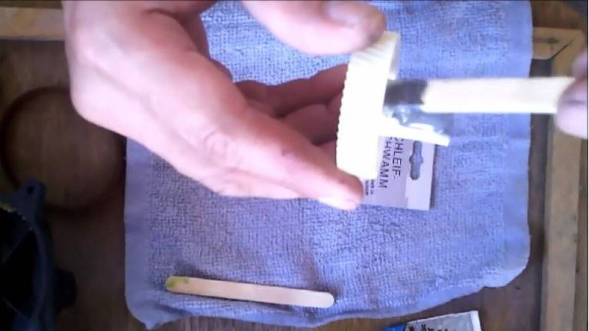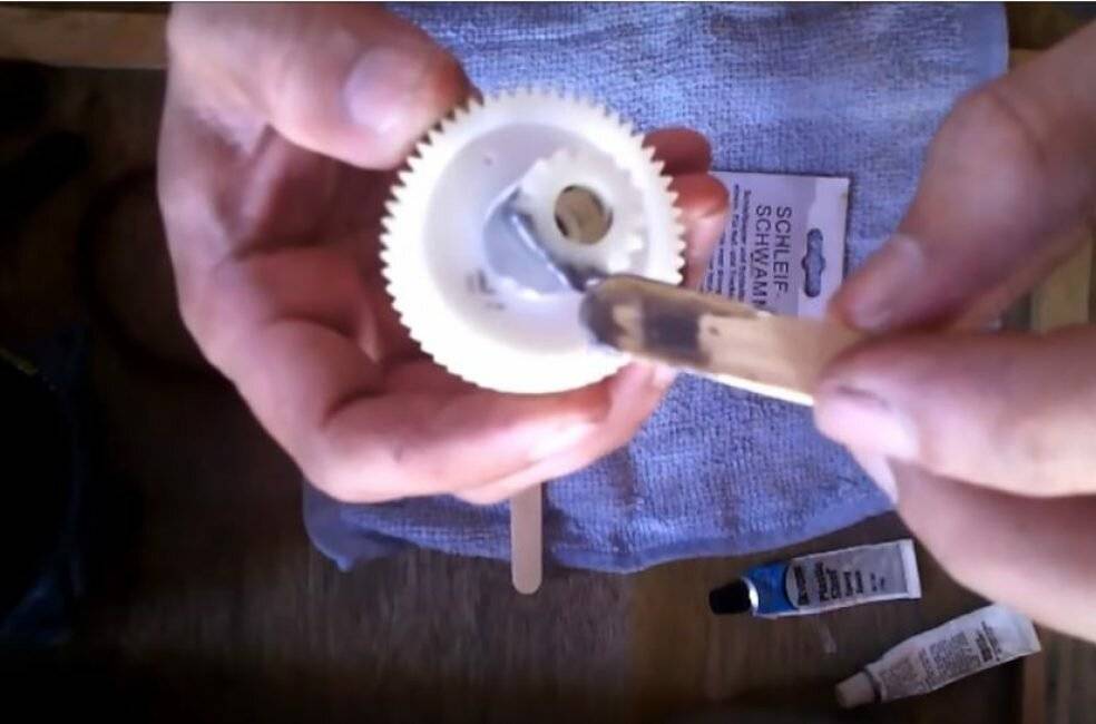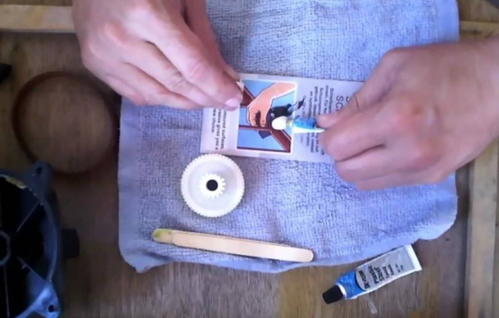 Когда клей достигнет нужной консистенции, наносим его с помощью палочки на поврежденный участок шестеренки.