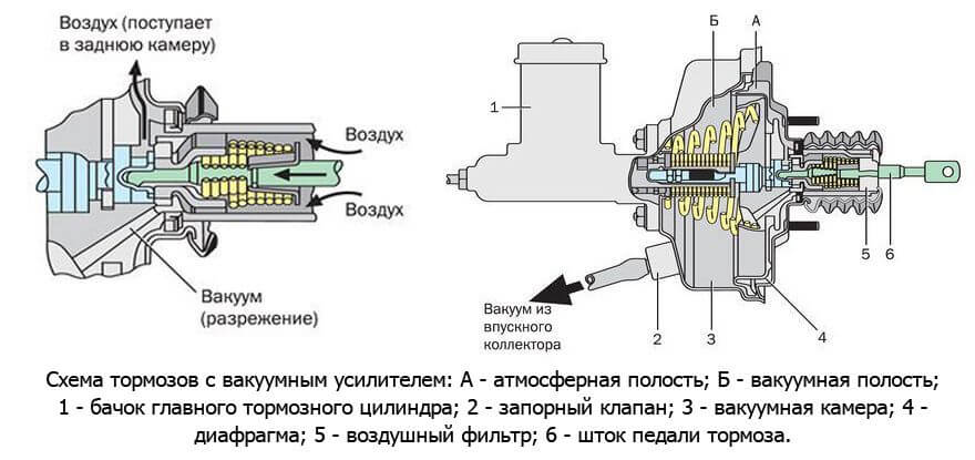 При торможении водитель, воздействуя на педаль, открывает специальный клапан, который соединяет вторую камеру с атмосферой, благодаря чему создается перепад давления в усилителе, обеспечивающий создание дополнительного воздействия на главный тормозной цилиндр – для торможения нужно прилагать меньшее усилие.