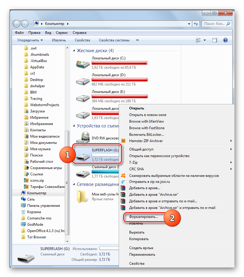 - при нажатии левой кнопкой на «съемный диск F:» (может быть другая буква) появляется всплывающее меню, из предлагаемых вариантов выбираем «Форматировать»;