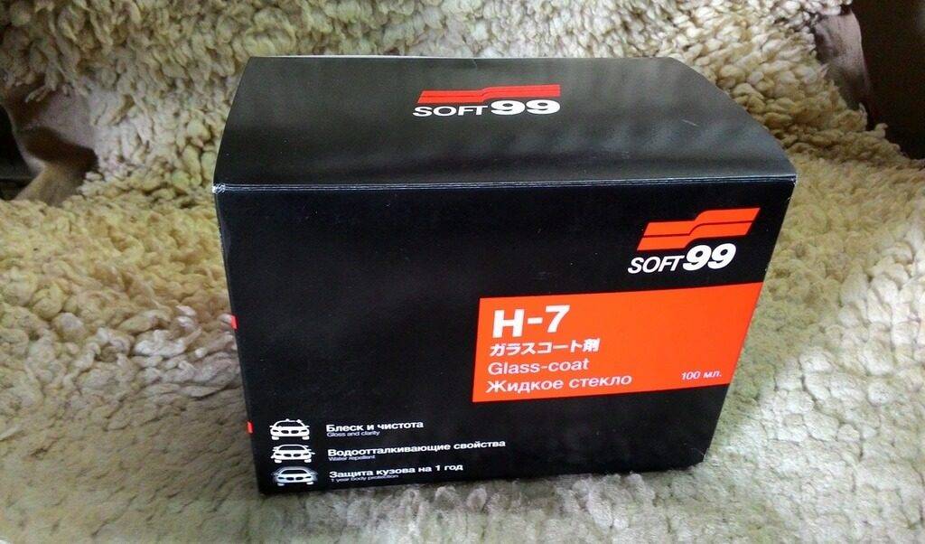 Жидкое стекло на основе калиевого силиката. Обладает хорошей адгезией, за счет чего такое покрытие можно наносить на любую окрашенную поверхность. Продается в баллонах по 100 мл. Не требует предварительной подготовки кузова. Способен обеспечить автомобилю защиту от влаги и бактерий, образующих грибок. Придает глянцевый блеск любому покрытию. Средняя стоимость одного баллона Soft 99 Glass Coating H-7 составляет 3 000 рублей (цена актуальна на 2020 год).