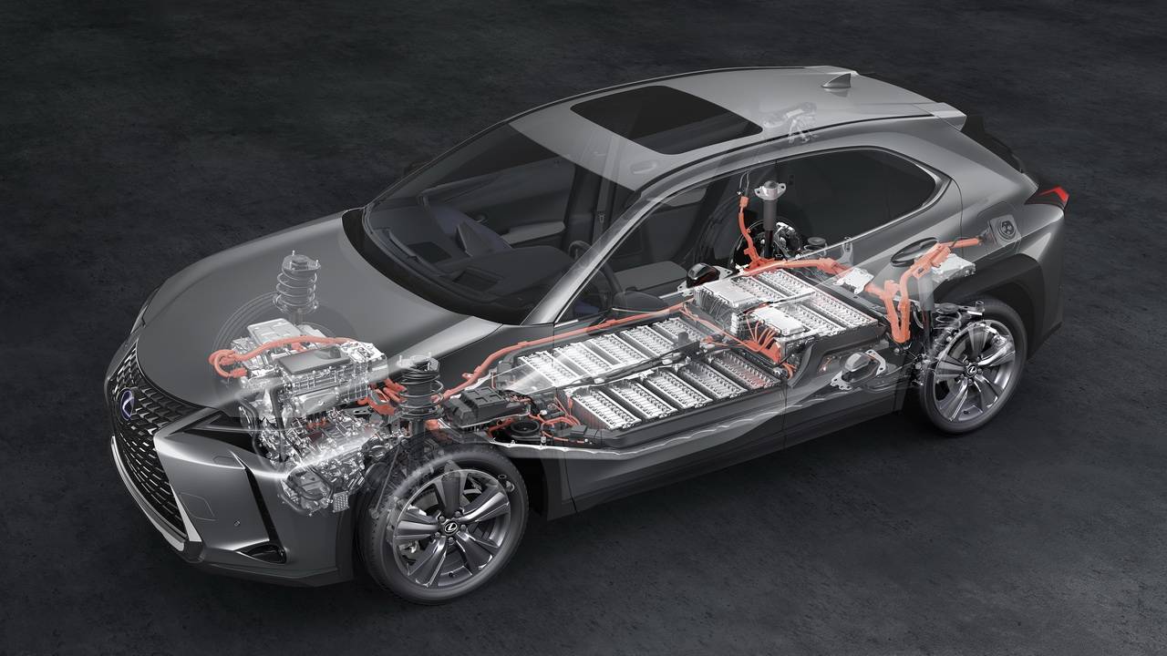 Японцы не стали разрабатывать новую модель, а снабдили электромотором уже существующую. В качестве донора выступил паркетник UX, базирующийся на платформе GA-C. Чтобы адаптировать «тележку» под установку тяжелого аккумулятора, пришлось ее серьезно дорабатывать, в частности, потребовались дополнительные усилители. В итоге литий-ионная батарея расположилась под полом, внеся значительный вклад в увеличение массы автомобиля – она возросла на 400 кг (до 1900 кг). Вспомогательному оборудованию нашлось место под капотом.