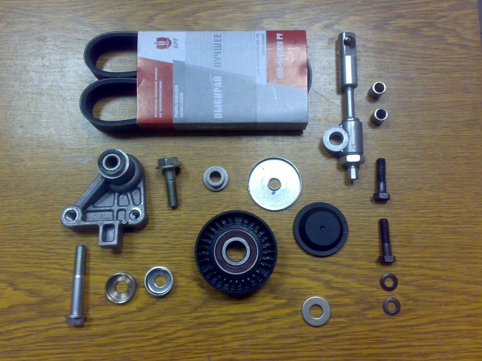 Основным элементом натяжителя является прижимной ролик. Сделан он из пластмассы, а внутрь запрессован закрытый подшипник. Ролик установлен на собственном кронштейне, который с помощью резьбовой шпильки способен передвигаться в вертикальной плоскости. Тем самым обеспечивается необходимый момент нажима на ремень. Чтобы кронштейн при движении автомобиля не перемещался самопроизвольно от вибрации двигателя, шпилька сверху затянута контргайкой. Вся конструкция размещается на кронштейне генератора. В нем сделаны два отверстия для крепления натяжителя ремня генератора «Калины».