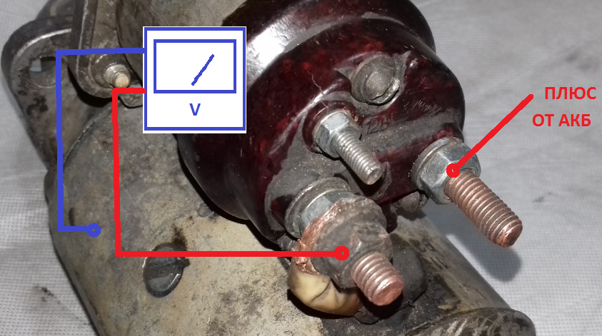 - Проверим, появляется ли напряжение +12 В на управляющем контакте стартера (это тонкий винт на втягивающем реле). Если напряжения нет, значит проверим дополнительное реле стартера и замок зажигания.