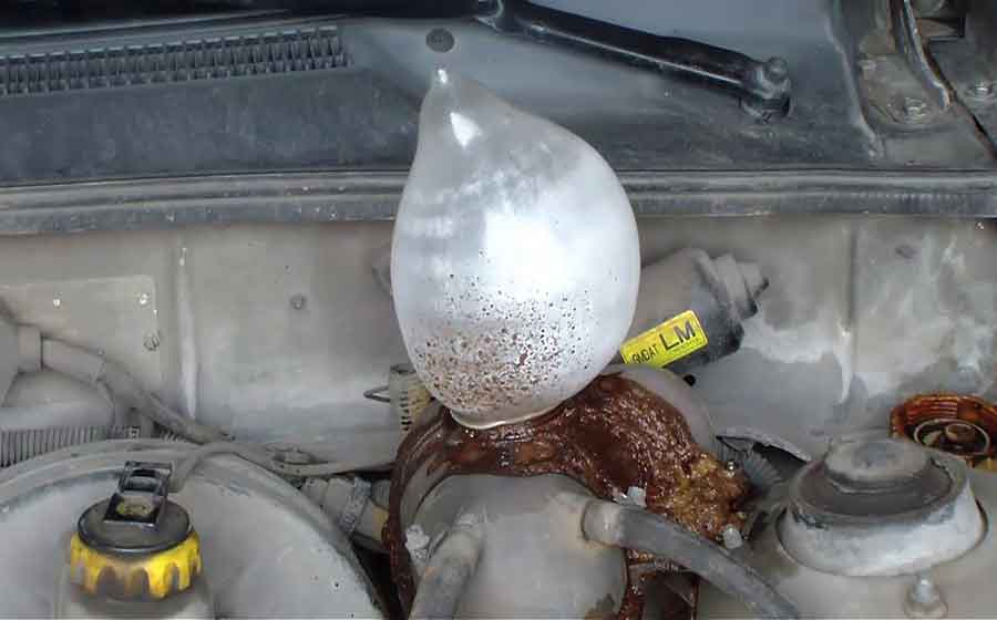 - Проверка наличия выхлопа в системе охлаждения. Чтобы сделать это, можно воспользоваться одним из 2 методов. Первый способ предусматривает откручивание крышки на радиаторе или расширительном бачке. Если внутри наблюдается активное бурление, это плохой признак. Второй метод заключается в применении воздушного шарика или обычного презерватива. Изделие натягивается на горловину бачка, сняв перед этим крышку. Затем запускается двигатель при оборотах около 3-5 тысяч в минуту. Если шарик или презерватив надувается (быстро или медленно), произошла разгерметизация. То есть в ближайшее время потребуется заменить прокладку.