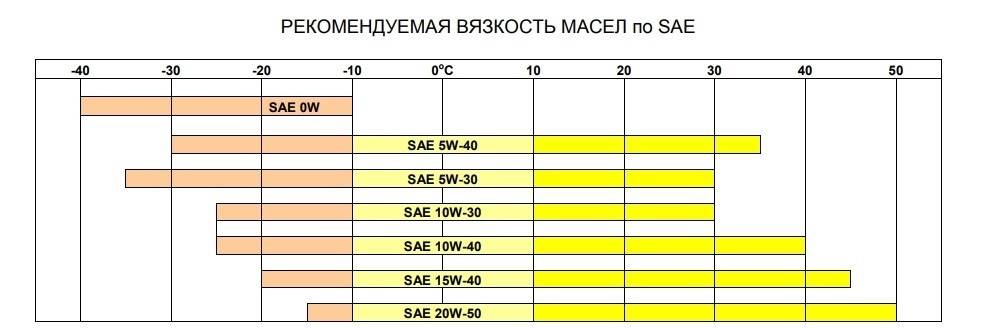 Это стоит знать! В регионах с холодным климатом лучше использовать 5W-30 или даже 0W-30. Но такое масло не рекомендуется использовать при температурах 30+ градусов тепла. Для жарких областей больше подойдёт вязкость 10W-40 или 20W-50, если холодов почти не бывает. Первая цифра вязкости показывает, при каких температурах масло станет густым, осложняя зимний запуск двигателя. Второй показатель указывает на максимальную рекомендованную температуру (когда масло сохраняет свои смазочные свойства). Рекомендуемая вязкость масел представлена в таблице ниже: