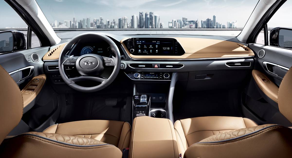В интерьере Sonata также произошло немало изменений. Дизайнеры пересмотрели центральную консоль, на которой теперь располагается «парящий» крупный дисплей системы мультимедиа и новый блок управления климатической установкой. Центральный тоннель также заметно преобразился. На нем установлен современный селектор управления КПП, ручка регулировок режима движения и новый подлокотник.