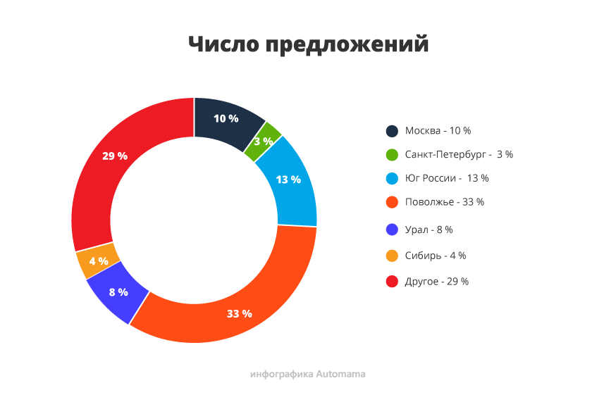 В Санкт-Петербурге вариантов тоже меньше обычного: около 3%. На юге страны ситуация уже иная, здесь собрано почти 15% предложений, что вполне типично. Ну а «идеологическим центром» для модели ожидаемо стало Поволжье: здесь, как и в случае с Вестой, сконцентрирована треть всех продающихся в стране машин.