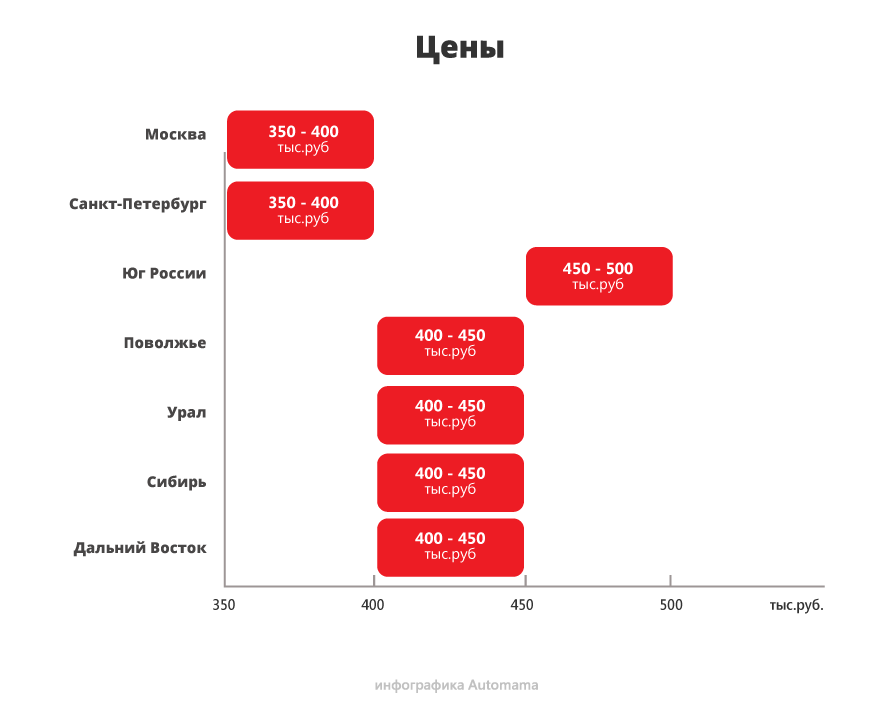 В Санкт-Петербурге картина схожая, несмотря на меньшее число предложений. На юге откровенно дешевых вариантов уже мало, цены в основном укладываются в коридор от 400 до 500 тысяч с крошечным пиком на 450-500. В Поволжье ценовой коридор тот же, но ощутимый пик приходится уже на 400-450 тысяч. На Урале и в Сибири картина аналогичная: здесь также с небольшим перевесом преобладают варианты за 400-450 тысяч рублей.