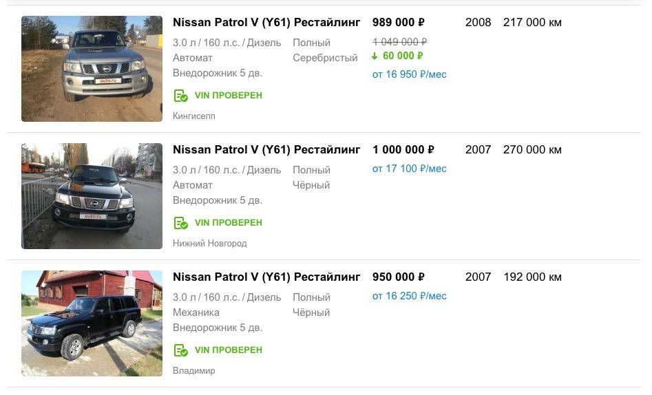 К нам по официальным каналам завозились только пятидверные модификации, хотя для ранних моделей характерны и «трёхдверки». За Patrol второй половины 80-х просят около 200 тысяч рублей, варианты помоложе (первой половины 90-х) стоят вдвое дороже, а если вы хотите пятое поколение внедорожника, то готовьте сумму от 800 тысяч. Отметим, что разброс цен очень велик даже в пределах экземпляров-одногодок с примерно одинаковым оснащением.