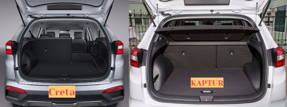 Действительно, в салоне Kaptur несильно, но всё же ощутимо комфортнее, чем в салоне Creta. Хотя, многие отмечали что если сидеть на заднем сиденье, то места в этих салонах примерно одинаково. Что же касается Hyundai, то по своему багажнику он даже немного опережает своего французского оппонента. Так, в Creta 402 л багажника, а вот в Kaptur е 387.