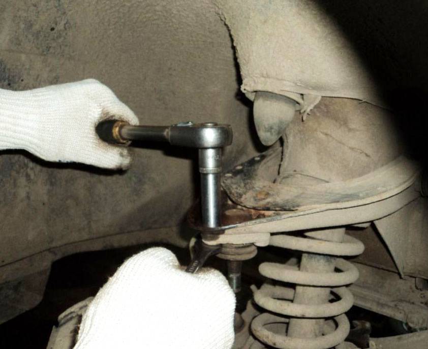 - Ослабляют затяжку гаек оси нижнего рычага.