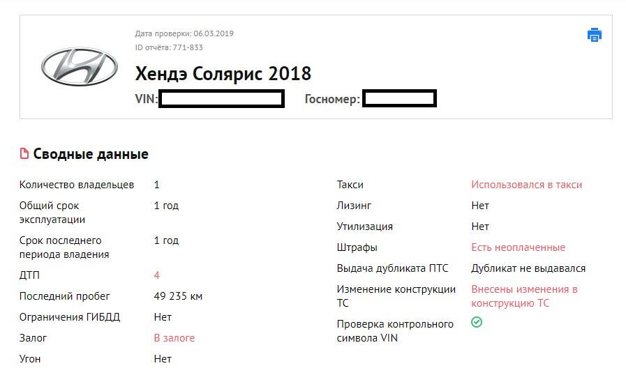 Так, проверка «Соляриса» 2018 года с пробегом более 49 тыс. км показала, что он использовался в такси, четыре раза попадал в ДТП, числится в залоге, имеет изменения в конструкции и неоплаченные штрафы: