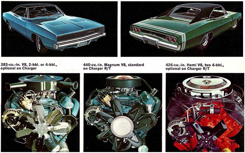 Как и говорилось выше Dodge Charger базировался на той же платформе, что и предшественник. Так что линейка моторов была во многом схожей. От маломощного V8 объемом 318 куб. дюймов (5,2 л) до могучих 440 Magnum (7,2 л) и 426 Hemi (7 л), мощностью 375 л.с. и 425 л.с. соответственно. Последние два были прерогативой специальной модификации R/T (Road/Track). Этим названием в Додж хотели подчеркнуть, что новый Charger хорош не только на дорогах общего пользования, но и на гоночном треке. С мотором Hemi, Charger от 0 до 100 км/ч разгонялся за каких-то 5,3 секунды, а четверть мили преодолевал за 13,5 сек. на выходе разгоняясь до 164 км/ч! Конечно же такие выдающиеся результаты благоприятно повлияли на продажи. Чарджеры раскупали очень активно и за первый год удалось продать 96 тысяч машин из них 17 тысяч в модификации RT.