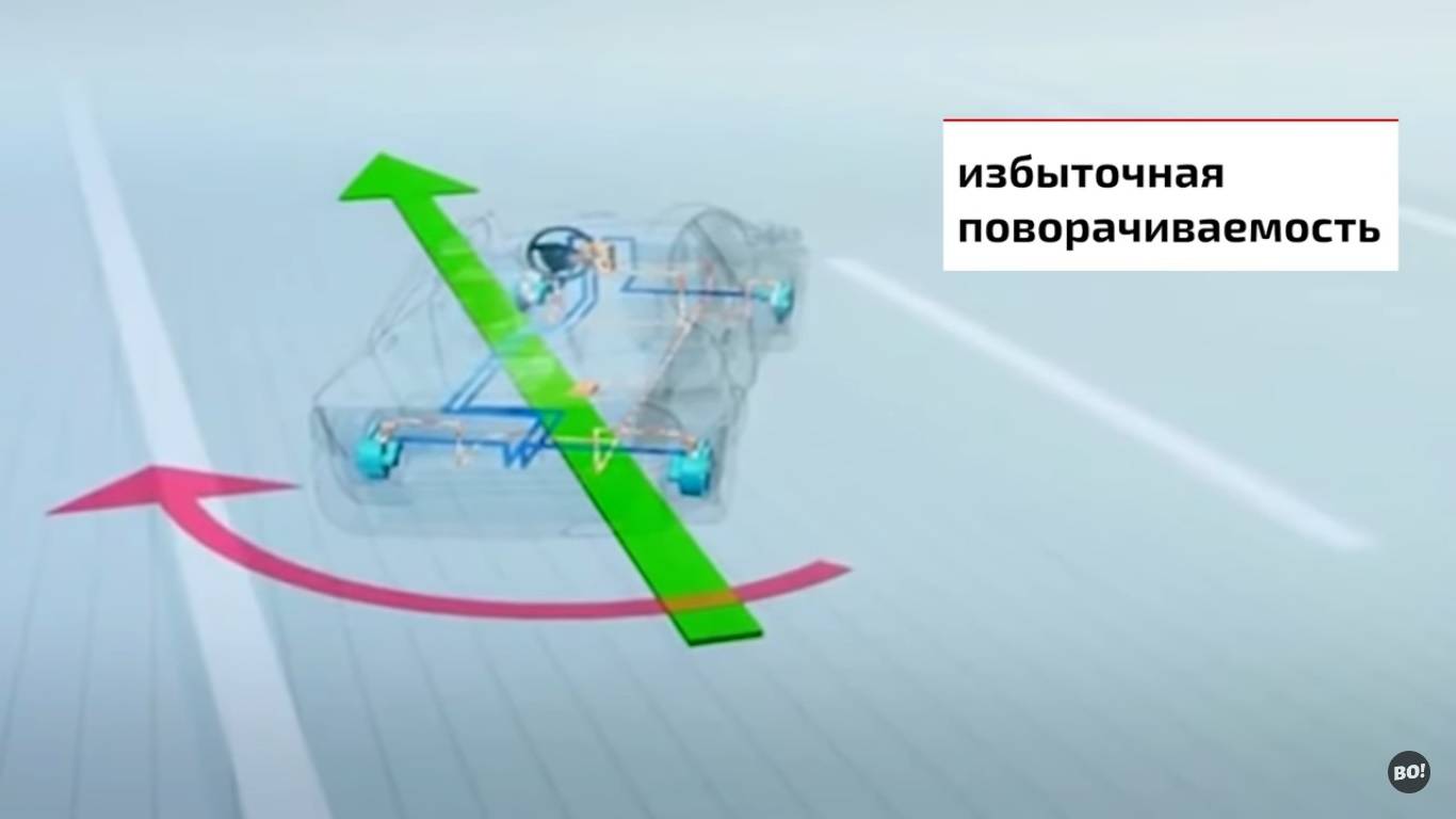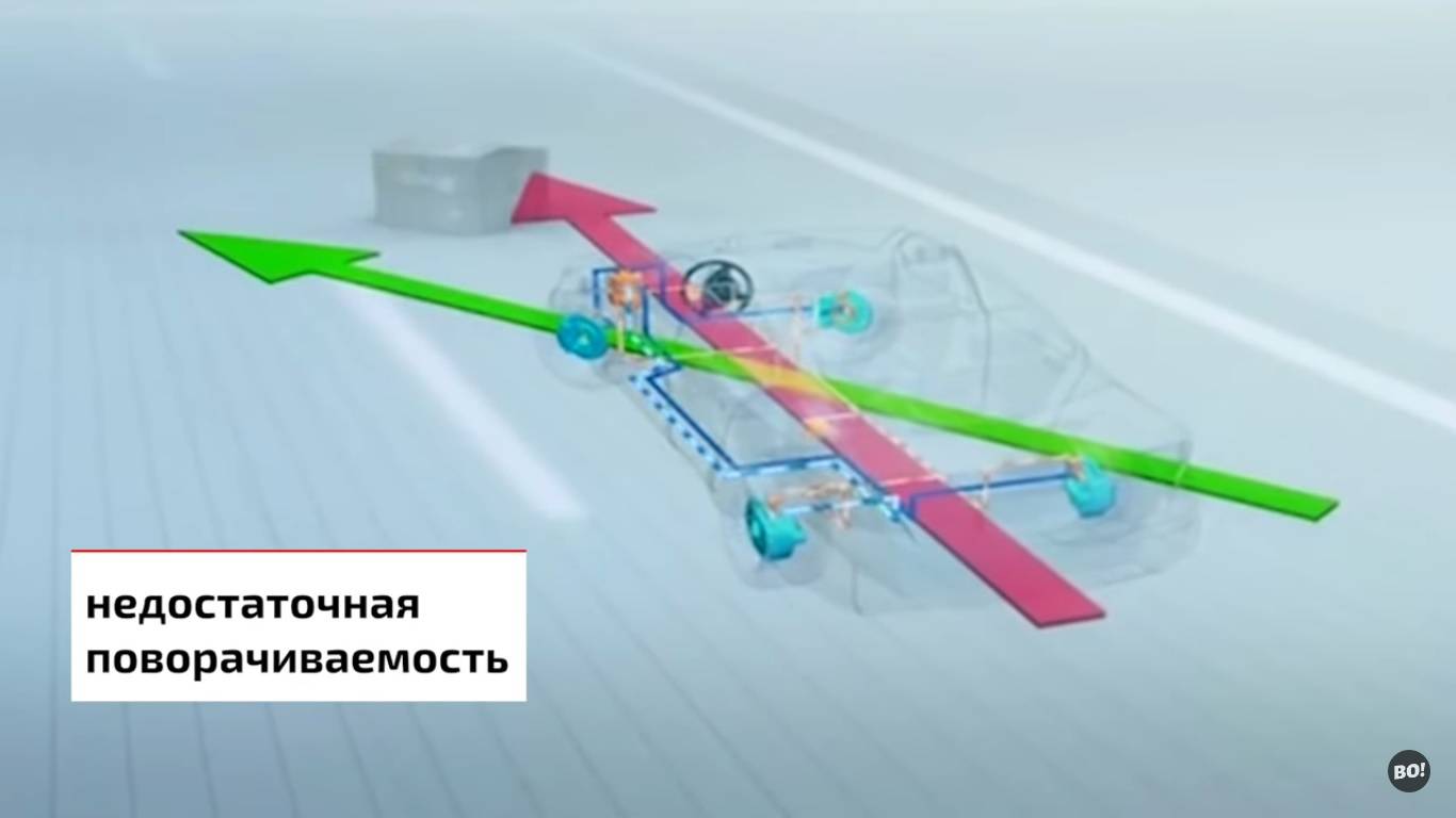 Давайте рассмотрим на примере, как эта система работает. Допустим, перед машиной неожиданно возникло препятствие, водитель резко поворачивает руль влево, но из-за высокой скорости машина не слушается и продолжает по инерции лететь прямо. Научно это называется «недостаточная поворачиваемость».